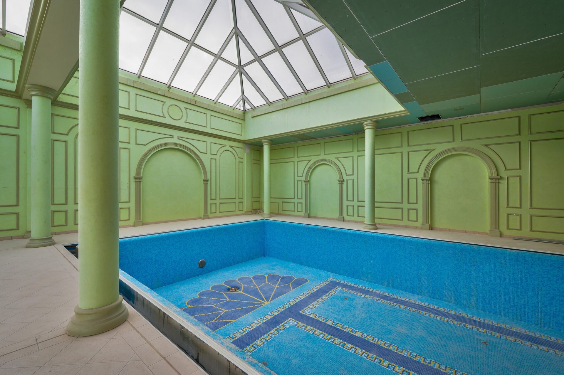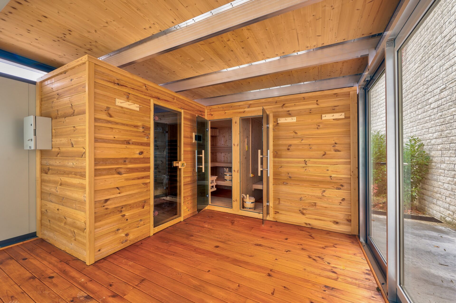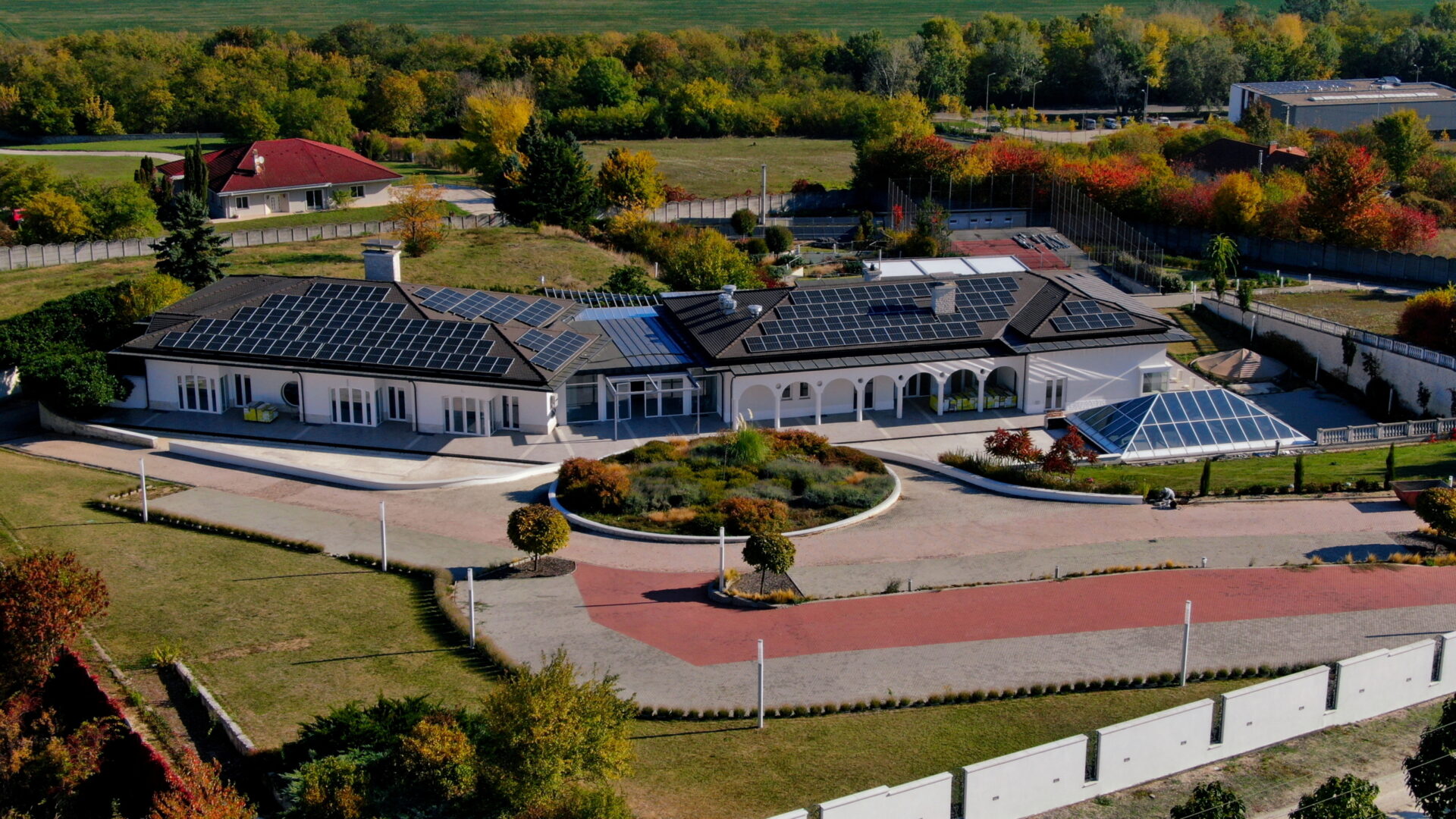 A villa alsó szintjén van egy exkluzív wellnessközpont, ahol egy 6 x 20 méteres, 1,5 m mély, Daikin hőszivattyúkkal fűtött beltéri MEDENCE, zuhanyzók, hatszemélyes GŐZKABIN, két öltözőhelyiség (mosdóval, zuhanyzóval) és egy USZODAI BÁR található. A medencénél a korábbi napkollektoros fűtés rásegítést is megtartották, valamint egy pelletkazán is bármikor beüzemelhető. A wellnessrészleg mellett, a közel 500 nm-es oldalteraszon kialakításra került egy kültéri szaunaház, amelyben két FINN SZAUNA és egy INFRASZAUNA van pihenőhelyiséggel, valamint egy frissen kiépített, fényjátékkal és különleges szórófejekkel ellátott Gardematic SZÖKŐKÚT is. A kertépítészek által gondosan megtervezett kertben található GYERMEKJÁTSZÓTÉR, valamint egy műanyag borítású TENISZPÁLYA, fűtött öltözőkkel. Az óriási birtokra telefonnal, távolból is nyitható, kovácsoltvas díszkapun keresztül lehet bejutni. A birtokon belül 30-40 autó parkolása megoldott a kiépített felszíni parkolóban, ahol három elektromos autótöltő oszlop is található. Ezenkívül a birtok főbejárata előtt a kamerával megfigyelt területen további 30-40 autó parkolhat biztonságosan.